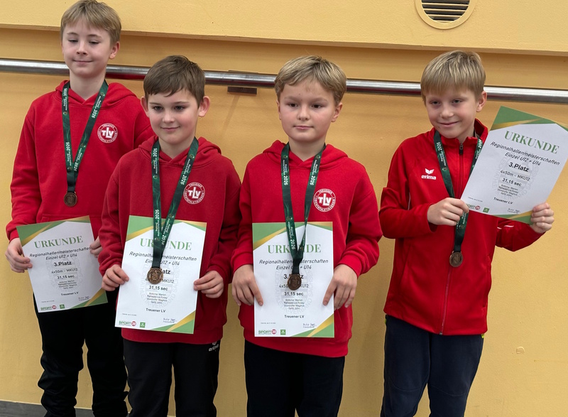 Bei den Regionalmeisterschaften U12/U14 in Chemnitz am 01.02.26 zeigten die Nachwuchssportler vom Treuener Leichtathletikverein starke Leistungen. Die 4x50m Staffel männlich U12 in der Besetzung Marlon Böttcher, Lio Rehwald, Magnus Stumhöfer und John Seitz sicherte sich den 3. Platz. Dies ist besonders bemerkenswert da wir als einziger Verein neben dem LAC Chemnitz eine eigene Vereinsstaffel an den Start bringen konnten. Anlaufschwierigkeiten prägten das Weitsprung-Programm: Im Additionsweitsprung wurden zwei Sprünge des linken Beins und zwei Sprünge des rechten Beins absolviert und dann jeweils der beste Sprung je Bein zu einer Gesamtweite addiert. Der Absprung mit dem falschen Bein führte dann direkt zu einem ungültigen Versuch und somit konnten John und Magnus für das linke Sprungbein keine Weite einbringen und vergaben dadurch vordere Platzierungen. Mit seinem starken Sprungbein rechts konnte sich John Seitz aber dennoch über eine neue persönliche Bestleistung mit 3,73m freuen. Lio Rehwald belegte den 8. Platz und Marlon den 10. Platz. Im 50m Sprint qualifizierte sich John als einziger Athlet für den Endlauf der M10 und erreichte dort Platz 5 mit persönlicher Bestzeit von 7,98 Sekunden. Zunächst sorgte auch Mila Wahl in der W13 für Jubel, denn sie kam im 800m Lauf als Dritte ins Ziel. Nachträglich wurde sie jedoch disqualifiziert, weil sie die Linie zum Innenraum überschritten hatte. Trotz technischer Widrigkeiten beim Weitsprung und einer unglücklichen Disqualifikation setzten unsere Athleten ein starkes Zeichen. Die Bronzemedaille in der Staffel sowie die persönlichen Bestleistungen von John Seitz untermauern das Potenzial der Nachwuchssportler und stimmen optimistisch für die kommenden Wettkämpfe.